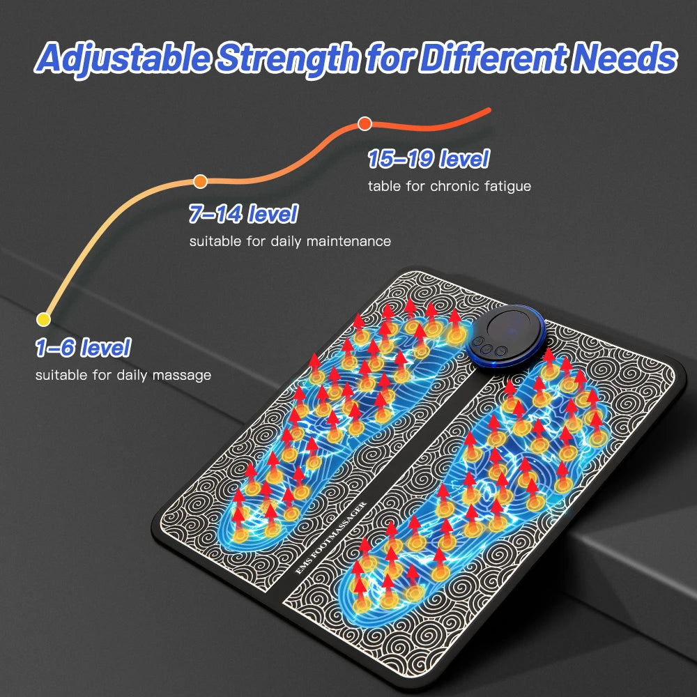"Electric Foot Massager Pad – EMS muscle stimulator mat for relaxing feet massage, improving circulation, and fitness recovery. USB rechargeable and easy to use.